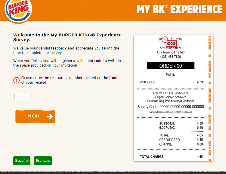 - Save the receipt. Within 48 hours of purchase, go to the official www.mybkexperience.com website and enter the restaurant number mentioned on your receipt.